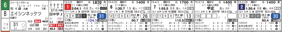 | 8 | 6 | ビーアマルフィ | 笹川翼 | 28 | ◎ | △ | 5 | 1 | 5 | リワードデュラン | 繁田健 | 27 | ○ | ○ | 2 | 7 | 1 |