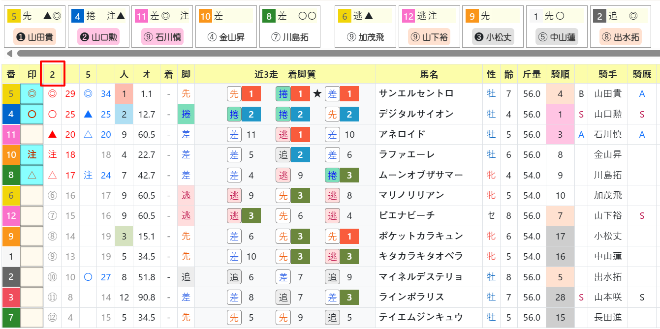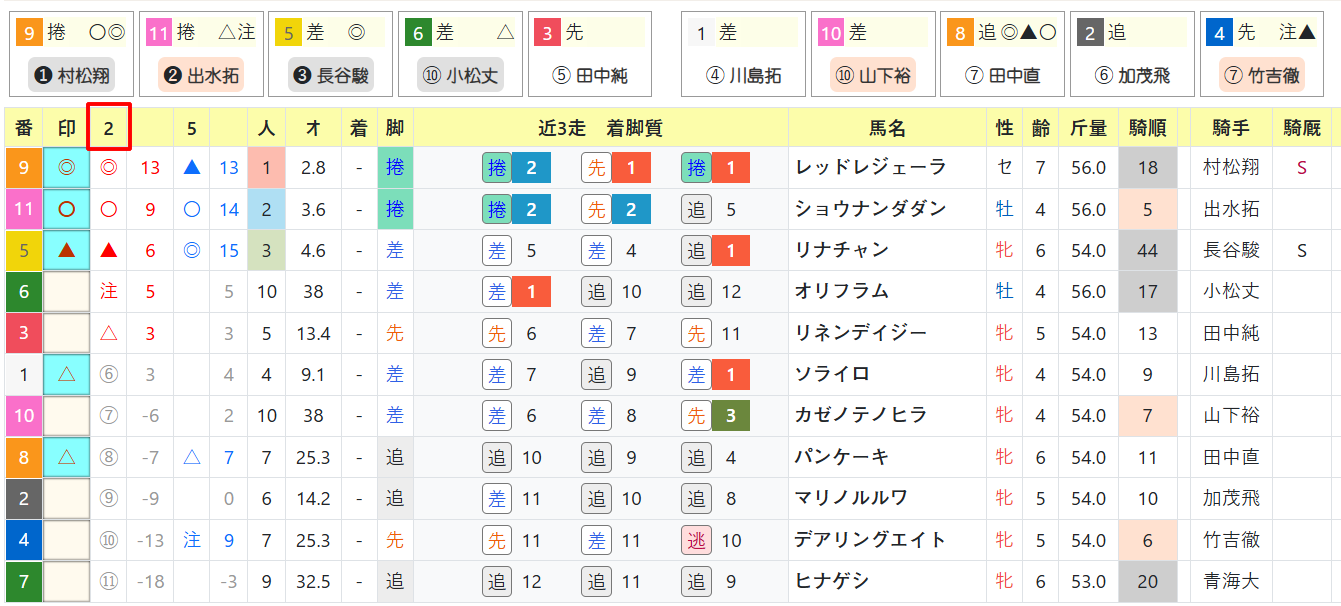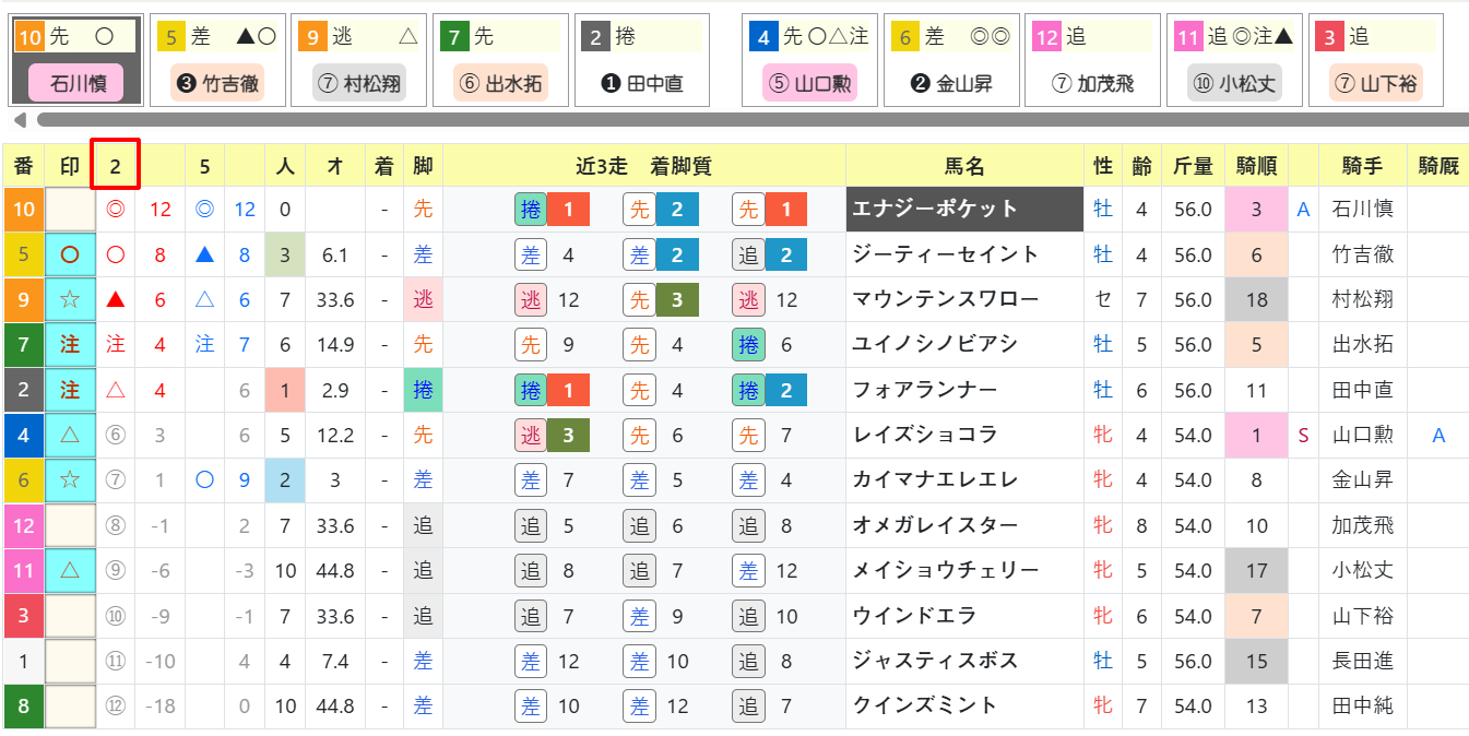 なのでこんな時にはひとまず4・レイズショコラ、11・メイショウチェリーのような逃げて好走した事のある馬は最初の段階で拾っておきます。