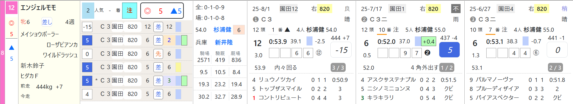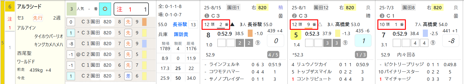 3走前の「46」が5走以内で最も高い指数で対象。出走馬の5走以内の指数では4番目に高い指数で注印。
