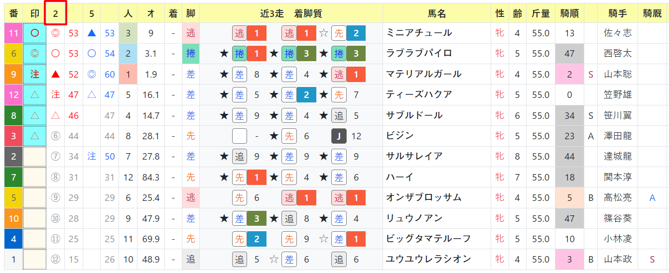 指数は〇ですが、◎11・ミニアチュールとは同値で、前を見ながら競馬を出来る強味もあります。