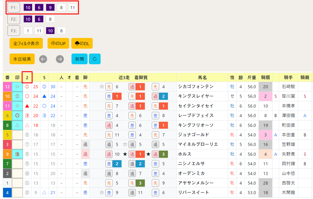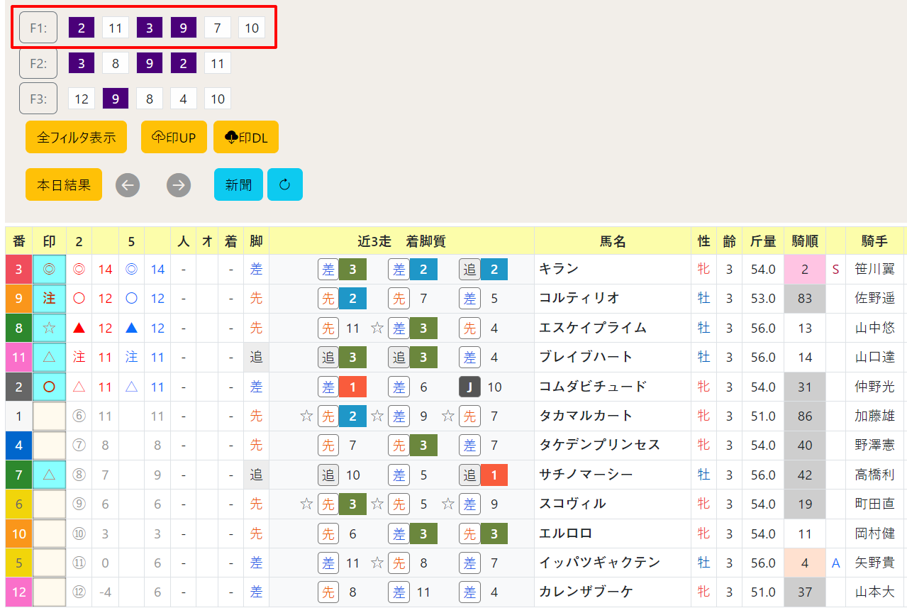 ので、フィルタ該当馬なら「F1」ライン(ダウンロードしたフィルタ)、馬柱から目視で探すなら上がり3Fタイム1・2位での好走馬。