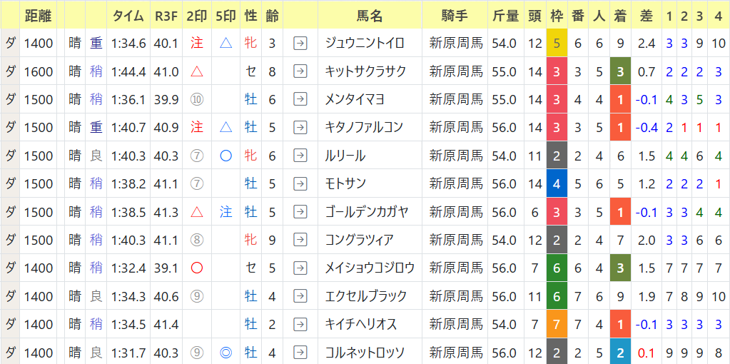 1~3着馬成績で背景色が黄色・オレンジは次走も3着以内の馬が複数いたという意味です