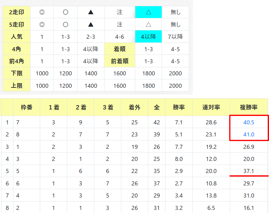 このように、ちょっと手間かもですが馬柱の特記まで確認してみてくださいな。