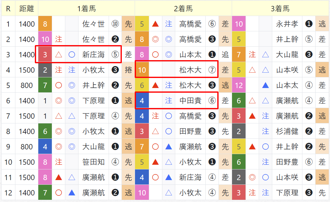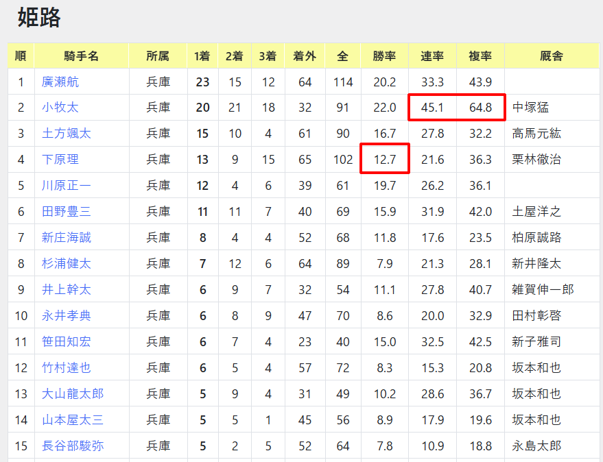 この表の騎手の箇所を、PCならマウスホバー、スマホならタップで、同じ騎手名の背景を青にして強調表示します。