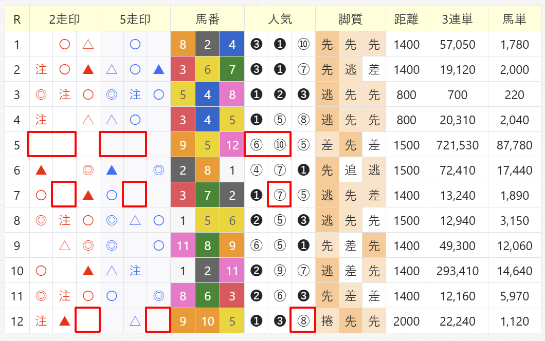 赤枠は、2・5走指数印がどちらも無印での人気薄の馬達。