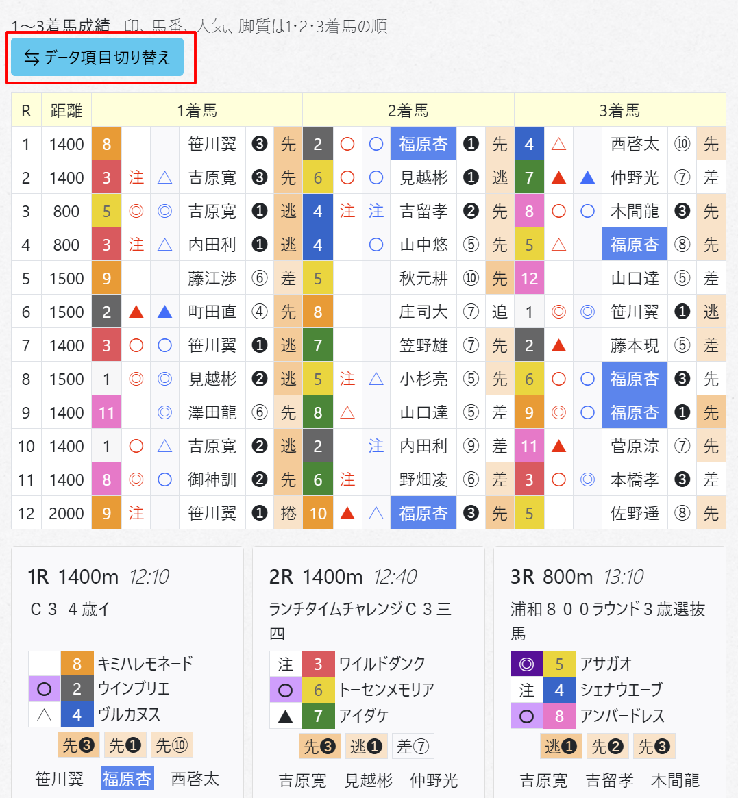 「データ項目切り替え」ボタンで、その日の成績一覧を切り替えて表示します。以前からのパターンに加えて、騎手名も確認出来るようにしました。